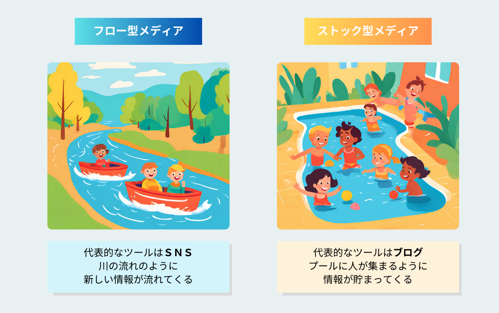 X(旧 Twitter)や Instagram などの SNS は『フロー型メディア』といい、時間の経過と共にコンテンツが流れていくメディアです。