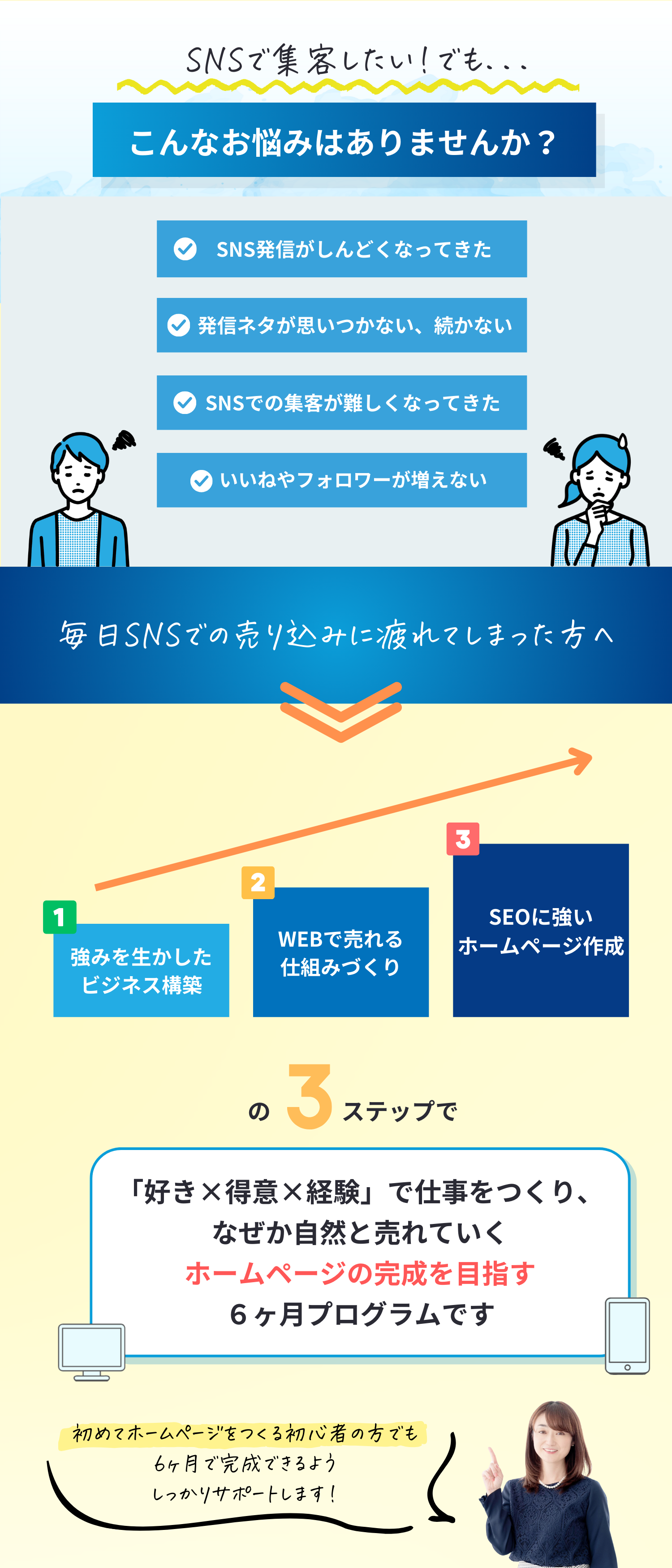 ビジネス構築→WEB発信→SEOに強いホームページ作成の3ステップで、